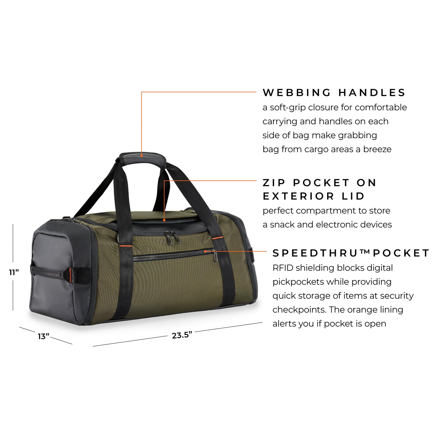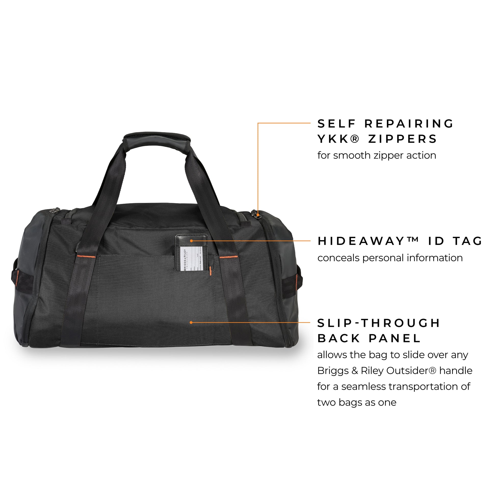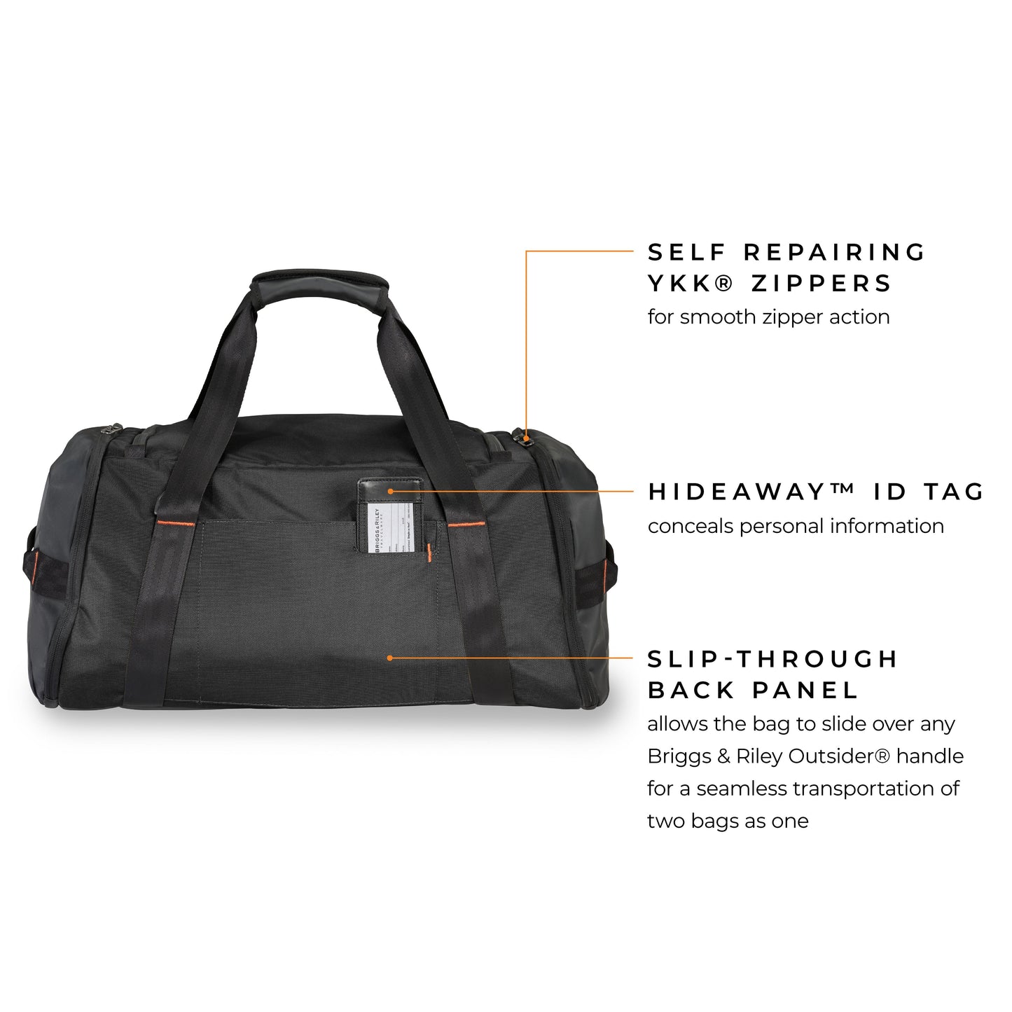 - Slip-through back panel allows the bag to slide over any Briggs & Riley Outsider® handle for a seamless transportation of two bags as one.