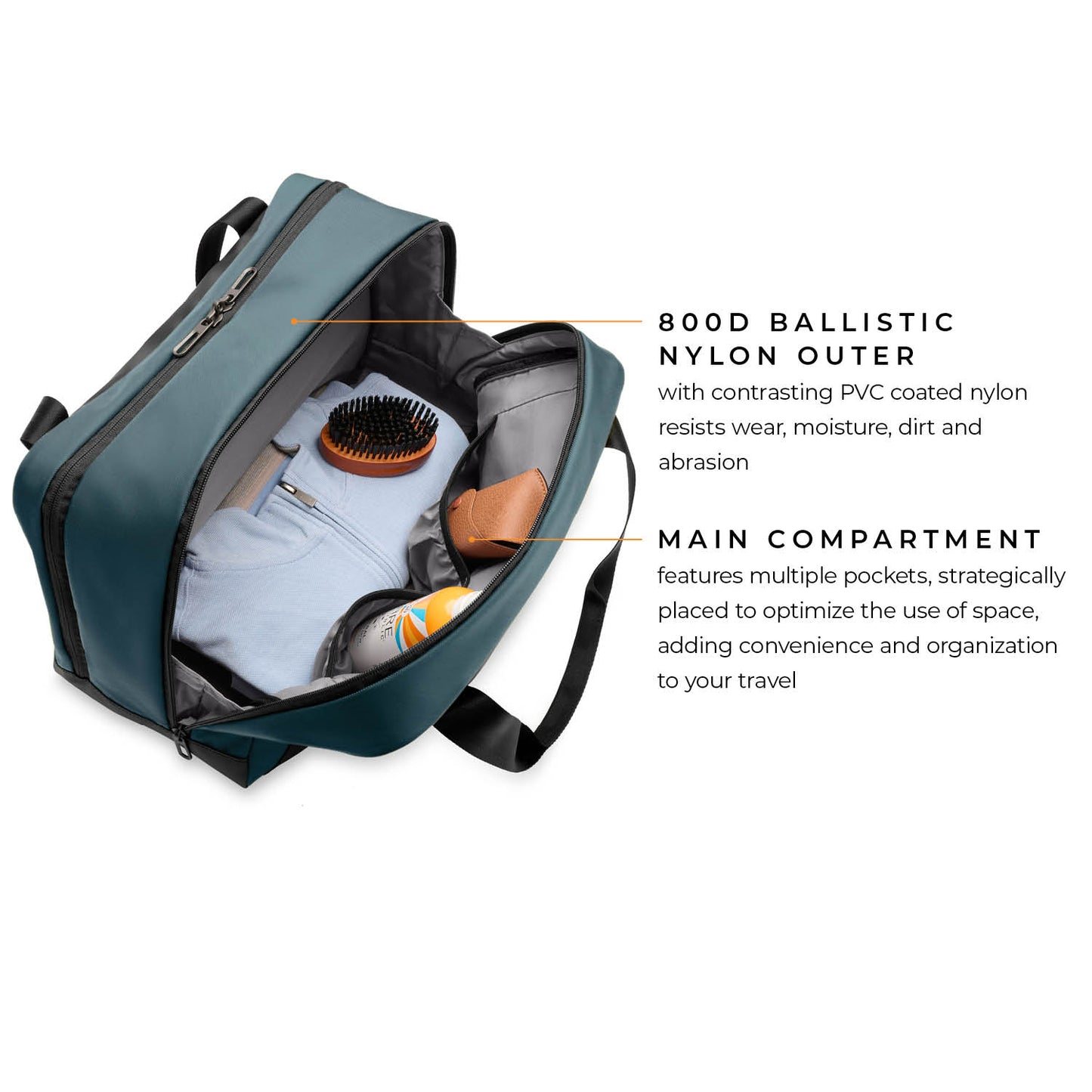 - 800D ballistic nylon outer with contrasting PVC coated nylon resists wear, moisture, dirt and abrasion.