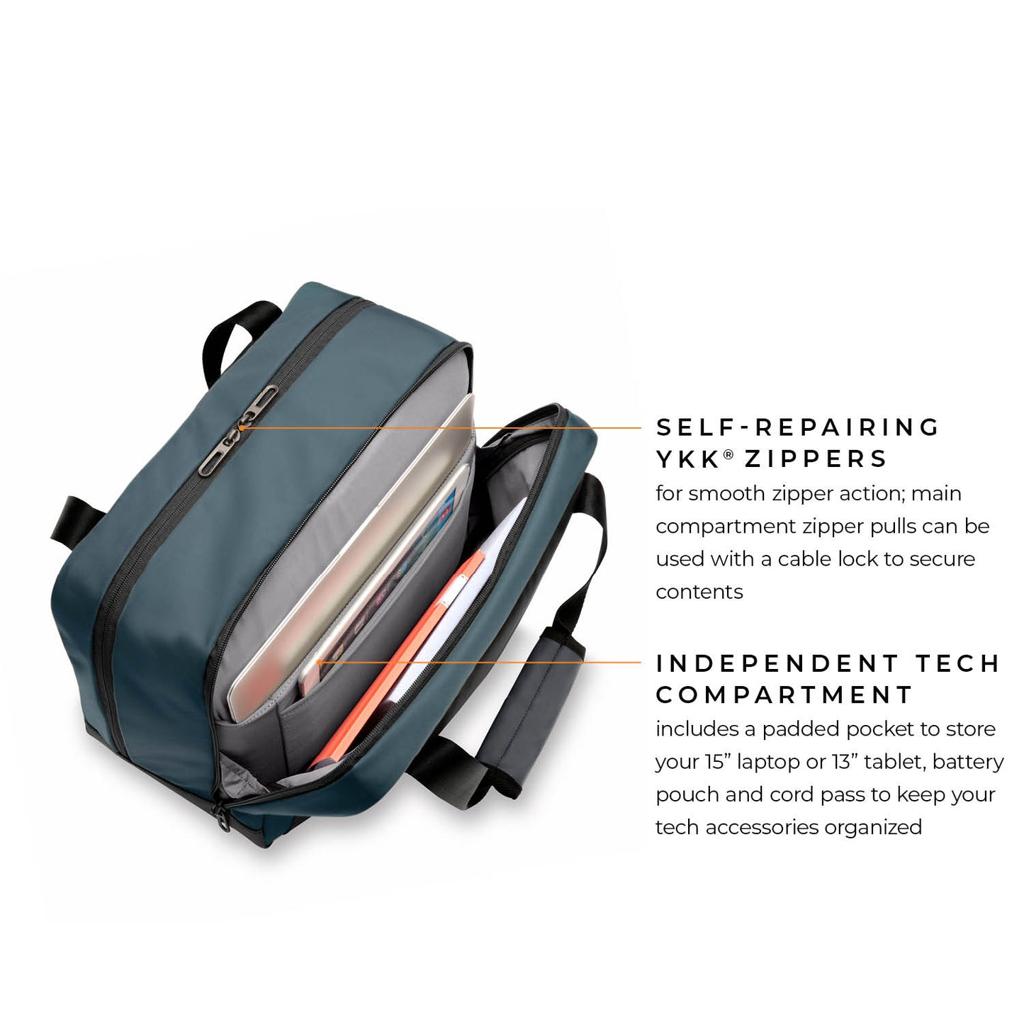 - Self-repairing YKK zippers for smooth zipper action; main compartment zipper pulls can be used with a cable lock to secure contents.