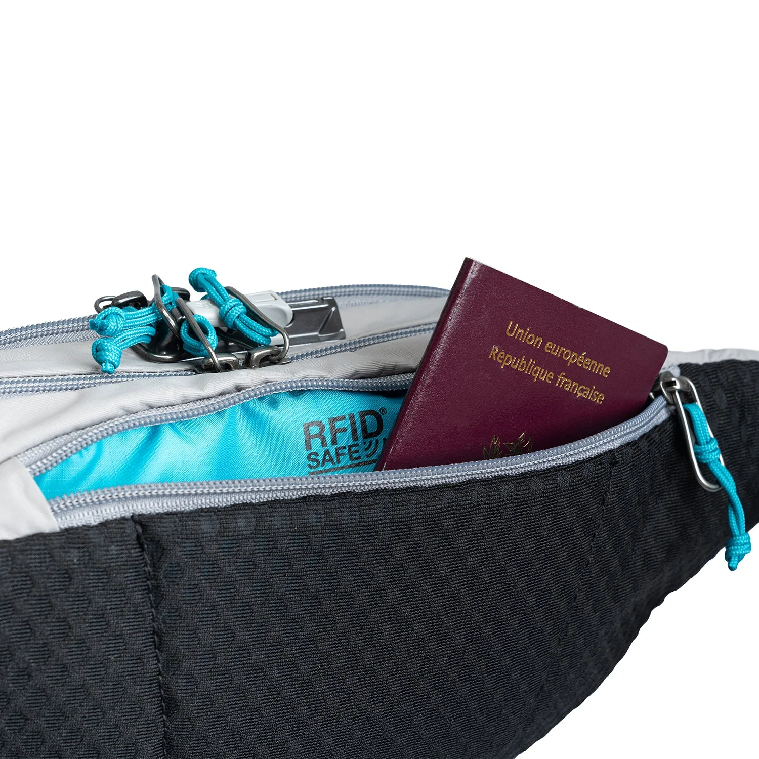 The Pacsafe ECO collection is our most sustainable collection yet by using almost 100% recycled materials and components. Get quick access to your essentials when you're on-the-go with this spacious and ultra-organized waist pack. Whether you prefer to wear this waist pack across your body or embrace the old-school style and wear it around your hips, you'll love wearing this bag on hikes, runs, rides, traveling, and other adventures. Keep your valuables safely hidden away with a secret pocket on the back. Made with 6 recycled plastic bottles, which were used in the lining, mesh, webbing, and labels. The outer shell fabric and certain buckles were made with ECONYL® regenerated nylon, which comes from waste such as discarded fishing nets, fabric scraps, carpets and industrial plastic.
