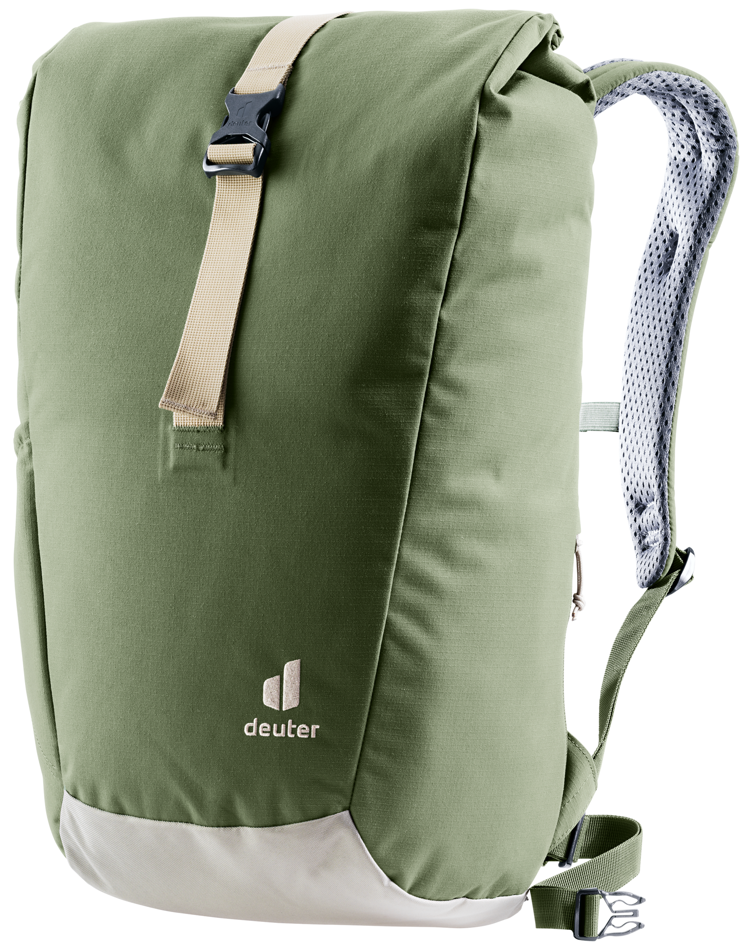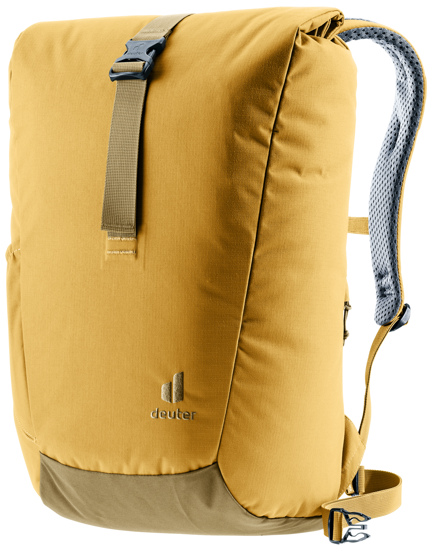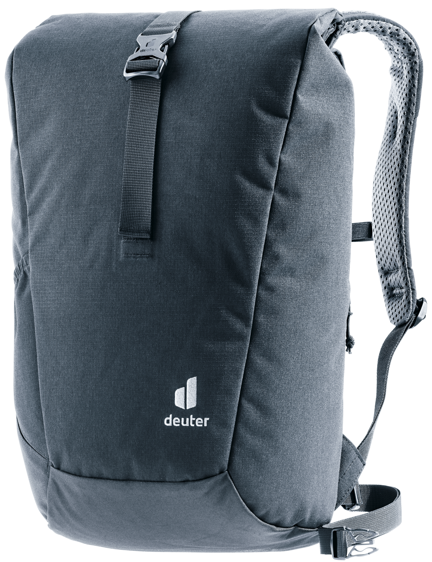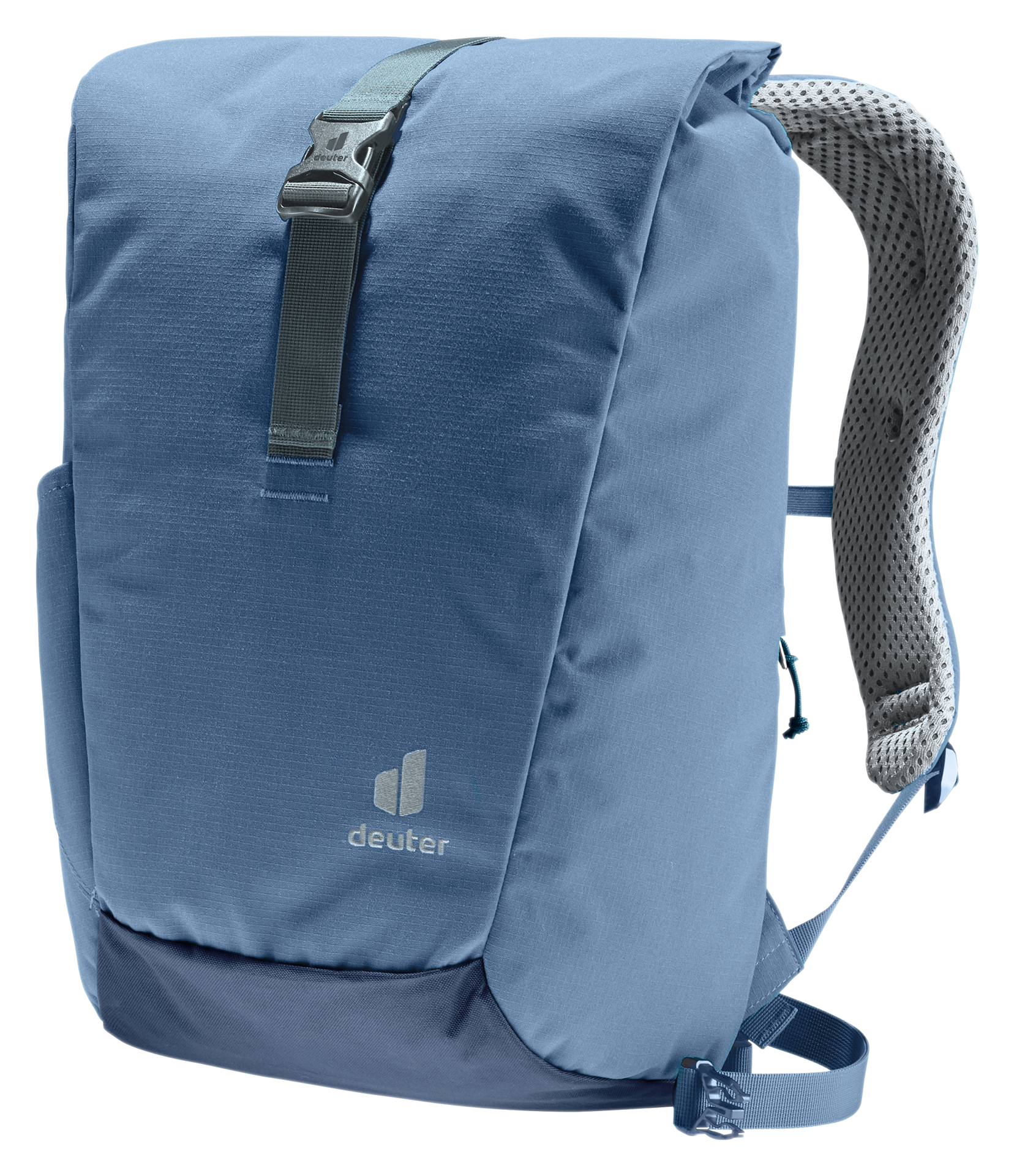 Featuring perforated, ergonomically formed shoulder straps and with the reduced contact surface of deuter’s Airstripes back system, the Stepout’s stand-out qualities are ventilation and carry comfort. A roll-top opening (with extra space), cell phone pocket at the side against the back and stretch side pockets allow speedy access to important items. Inside there is a document pouch, laptop sleeve and water bottle sleeve for more organized packing. The PFC-free fabric of this Green Button-certified bluesign® product is made from 100% recycled PET bottles (26 x 0.5-liter bottles) and according to bluesign® standards.