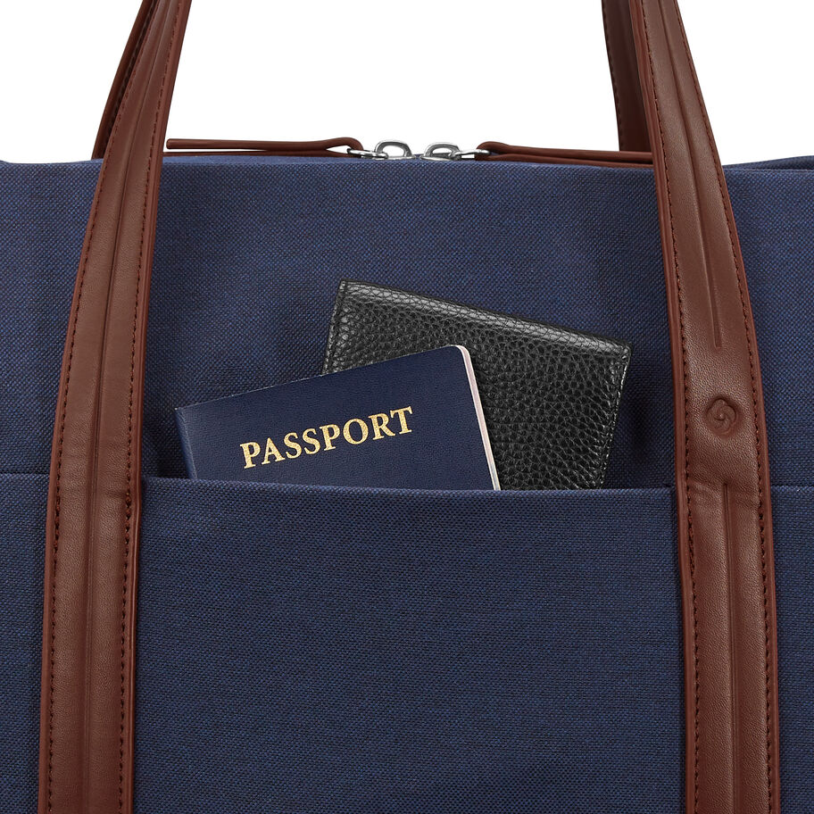- Smart sleeve luggage pass-thru fits over most upright luggage handles for easy stacking in the airport or on the go.