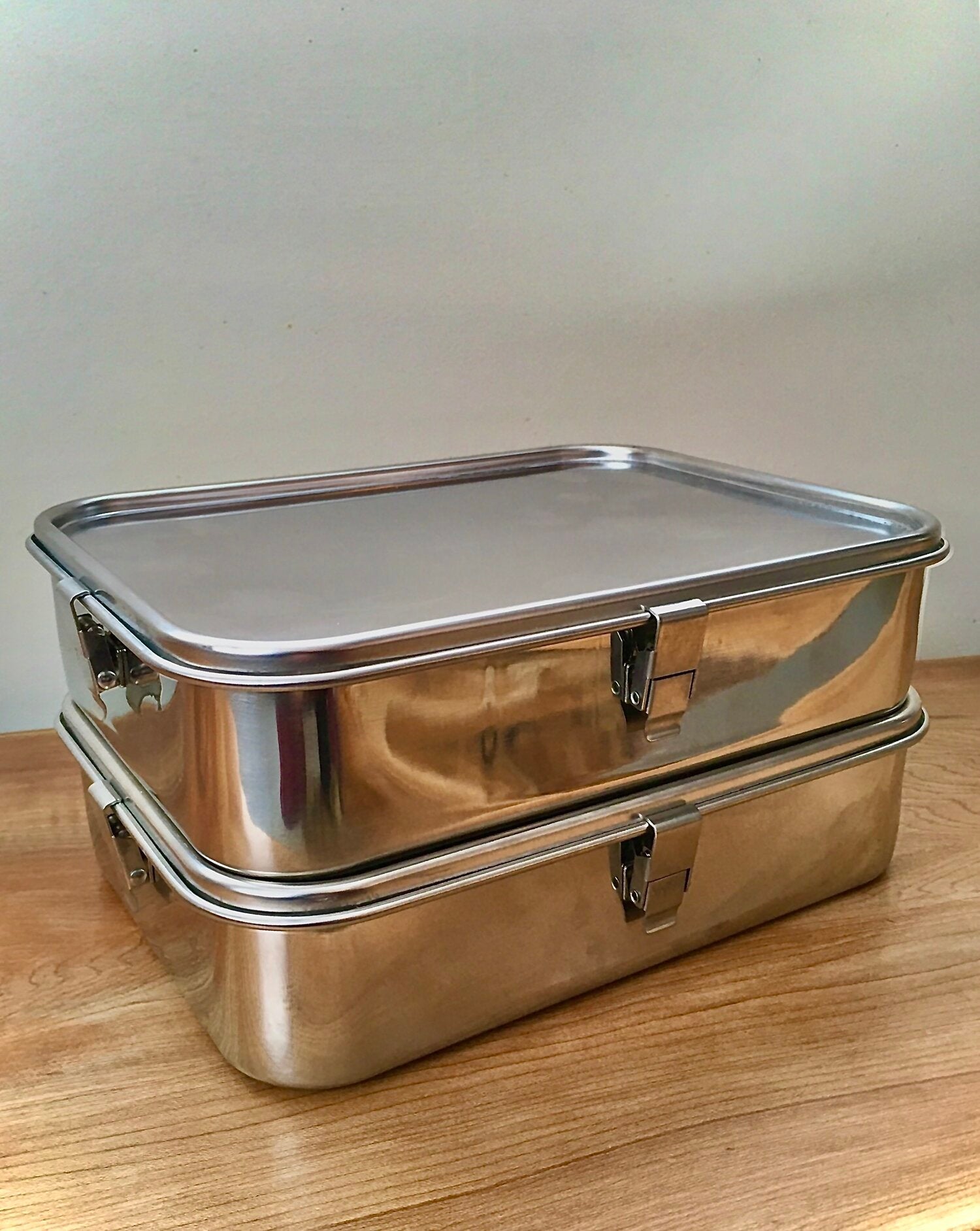A handy Bento container! A large container great for meals on the go, or storing your left overs. It is airtight with clips that snap the lid down. Made from 18/0 food grade stainless steel.