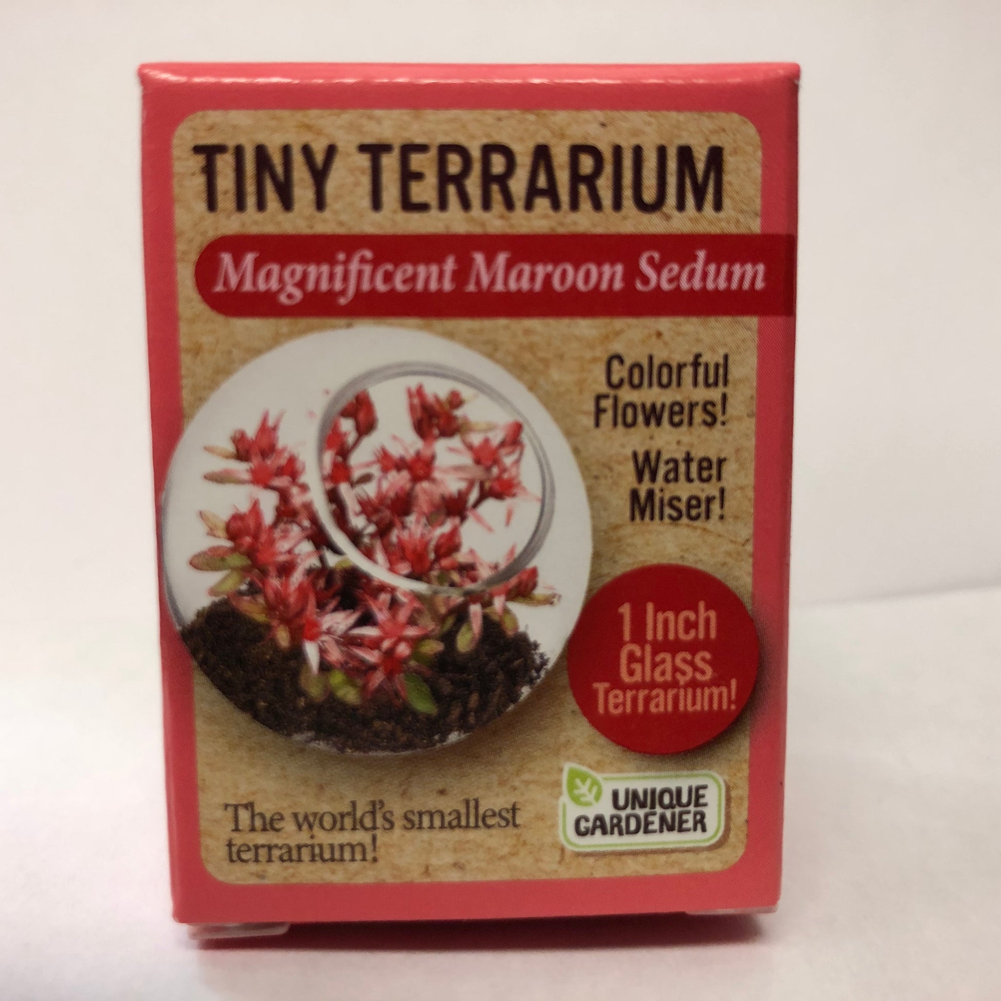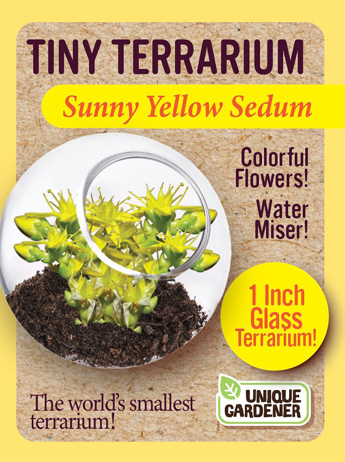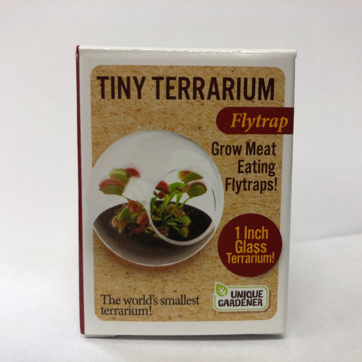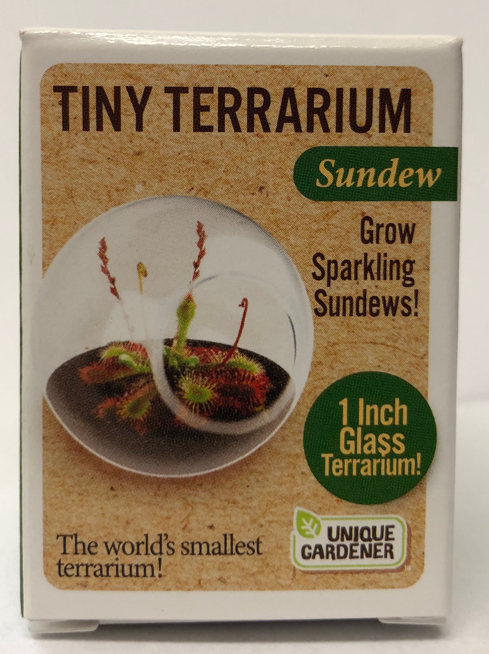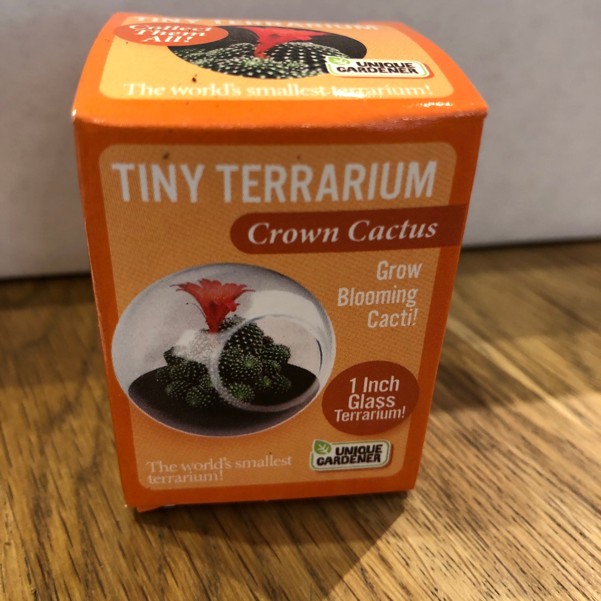 - Box content includes tiny glass terrarium, soil and seeds. Instructions are printed on packaging